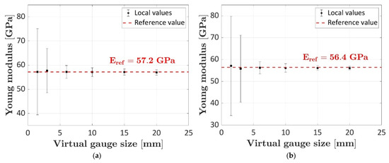 The mean and the uncertainty were determined by repeating the calculation for 100 different random positions of each virtual strain gauge within the framed area. As shown in Figure 9, as 100 virtual strain gauges are considered for each size, the mean values are close or coincident with the reference Young’s modulus (57.2 GPa for specimen #1 and 56.4 GPa for specimen #2). However, as the size of the virtual strain gauge decreases, the uncertainty rapidly increases, thus suggesting small strain gauges, i.e., those whose dimensions are comparable with the material meso-structure size, must be adopted with particular attention. The considerable variation observed in smaller virtual strain gauges can be explained by applying the gauge primarily on matrix or fibers. It is also worth noting the confidence intervals of the 15 × 15 and 20 × 20 virtual strain gauges of specimen #2 are consistently smaller than those of the corresponding virtual strain gauges of specimen #1. This can be attributed to the uniform band shape of the strain field of specimen #2, as observed in Figure 8.