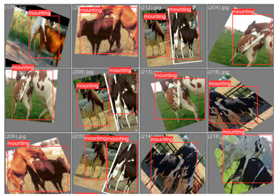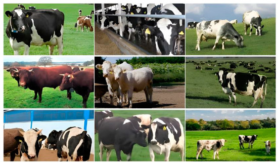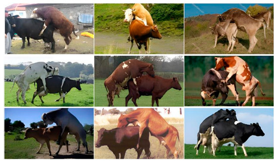 After the first calving, a dairy cow can be counted in the productive stage [34]. The lifecycle in this stage is a sequence of lactation (up to 305 days), dry period (about 60 days), and calving (about 280 days) [34,35,36]. Even if samples are collected in an area with many animals due to the fact that obtaining comprehensive data from different animals would take a year and necessitate continuous observation by an individual who tags these moments through video, it has been decided that the process of data collection is both laborious and time consuming. To alleviate the burden on human resources, expedite the process, and expand the dataset, we opted to source images featuring both mounting and non-mounting behavior from the internet. Our research is centered around a dataset comprising cows of diverse breeds, specifically Simmental, Holstein, Jersey, and Brown Swiss (Montofon). This dataset encompasses images of cows engaged in mounting behavior and those not involved in such activities, all captured from various angles. The dataset was curated by collating images from online sources, specifically from search engines where cow images are publicly shared. Importantly, each image underwent a manual labeling process to categorize them appropriately.