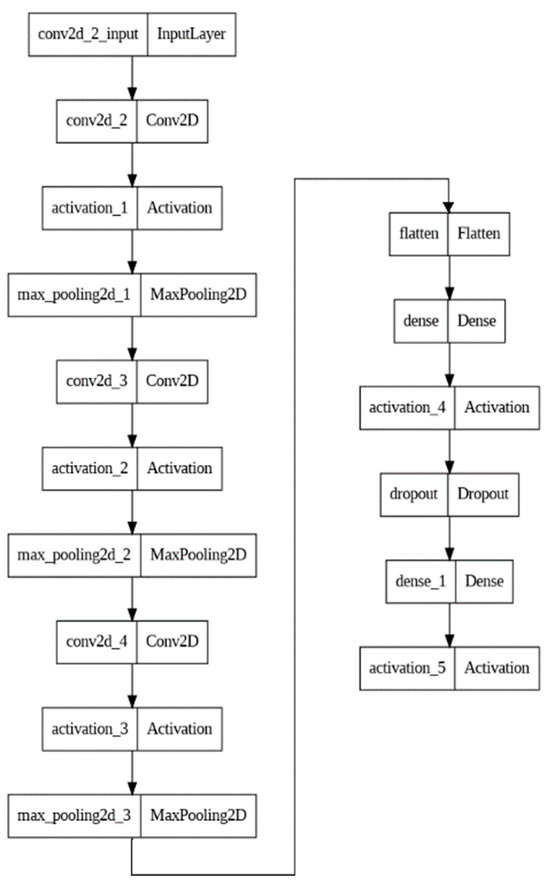 A CNN was used only for mounting detection purposes; therefore, only the estrus dataset consisting of images of mounting or non-mounting situations was used, and the images were collected from the internet. Artificial neural networks are models that are based on the functioning of the human brain. The goal of this structure is to perform the learning process, interpret the acquired knowledge, and make decisions autonomously. Convolutional neural networks (CNNs) are a type of artificial neural network that are used primarily for image recognition and computer vision tasks, although they can also be used for other types of data processing, such as natural language processing. CNNs have revolutionized the field of computer vision and continue to be an active area of research and development [38,39]. Computers must recognize and convert incoming images into a computationally manageable matrix format. The first layer in a CNN is a convolutional layer, which applies a set of filters to the input image to extract features, such as edges and corners. The output of the convolutional layer is then passed through an activation function to introduce non-linearity into the model. The output of the activation function is then passed through a pooling layer, which reduces the dimensionality of the feature maps while retaining the most important information. The final output of the network is typically a fully connected layer that performs classification. It learns the impact of these differences on the label during the training phase and then uses this knowledge to make predictions for new images. In this study, a 9-layer convolutional neural network was used, as seen in Figure 5, and the network was trained for 20 epochs with binary classification.