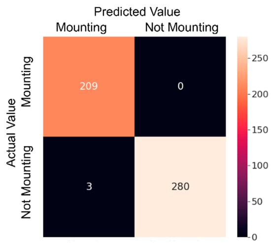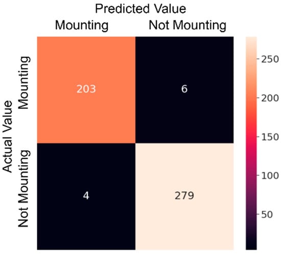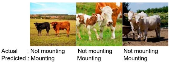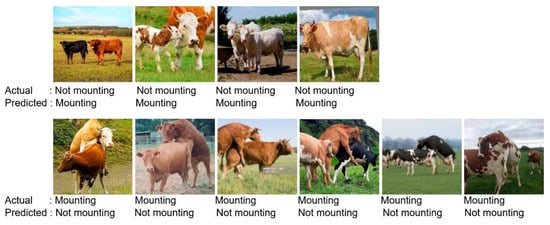 The CNN model, which is a classical approach to image recognition problems, has been developed for this study. The developed CNN model consists of nine layers, and the dataset has been divided into 70% for training and 30% for testing. The CNN training process consists of 20 epochs, with a duration of 25.2 min. While training the CNN model, the GPU services of Google Colab, specifically the T4 GPU, were utilized. In this process, using 32 GB of RAM proved to be sufficient. After training on the training dataset for 20 epochs, Figure 7 shows that the model achieved an accuracy rate of 98%, as represented in Table 3. The model’s loss value is calculated to be 0.1. Interpreting the CNN results requires an understanding of the metrics used to measure the model’s performance, consideration of the dataset and training parameters used, and careful analysis of the results. Figure 8 presents a confusion matrix, indicating that the CNN model correctly identified 203 out of 207 estrus cases in the test dataset. In the negative cases where the cows did not show estrus, it accurately detected 279 out of 285 cases. Figure 9 includes an example of prediction results from the trained model. It is observed that the second case is the false predictions, and this error seems to stem from the model perceiving the size difference between cows and calves as a feature. In Figure 9, it is observed that errors occur in images predicted as false not mounting when the feet are aligned, in contact, or very close. In images predicted as false mounting, incorrect results are noticeable in crowded situations. However, despite all these errors, only 10 out of a total of 492 test images have been predicted as false.