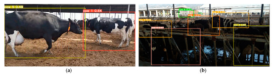 YOLO cow identification: (a) cow identification from a pan-tilt camera; (b) cow identification from a drone camera.