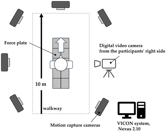 To ensure the validity of the measurements, simultaneous 3D motion analysis (3D-MA) was conducted alongside the video measurements using the Vicon Nexus 2.10 system (Vicon Motion Systems Ltd., Oxford, UK). The Vicon motion system consisted of 14 optical cameras (Eight MX T10-S, Six Vero v2.2, Vicon Motion Systems Ltd., Oxford, UK) with a sampling frequency of 120 Hz and 10 force plates (OR6, Advanced Mechanical Technology Inc., Watertown, NY, USA) with a sampling frequency of 1200 Hz. According to the Vicon Plug-in Gait marker placement protocol, a total of 34 reflective markers were attached to specific anatomical landmarks on each participant. These markers were placed on the 7th cervical vertebra, 10th thoracic vertebra, clavicle, sternum, right scapula, and bilaterally on the front head, back head, shoulder, elbow, thumb-side wrist, pinkie side wrist, head of the second metacarpal, anterior superior iliac spine, posterior superior iliac spine, lateral thigh, lateral and medial femoral epicondyle, lateral shank, lateral and medial malleolus, the second metatarsal head, and calcaneus. Before the motion analysis trials, a static trial was conducted with each participant assuming a neutral standing position. This trial helped align the participants with the global laboratory coordinate system and establish their local joint coordinates.