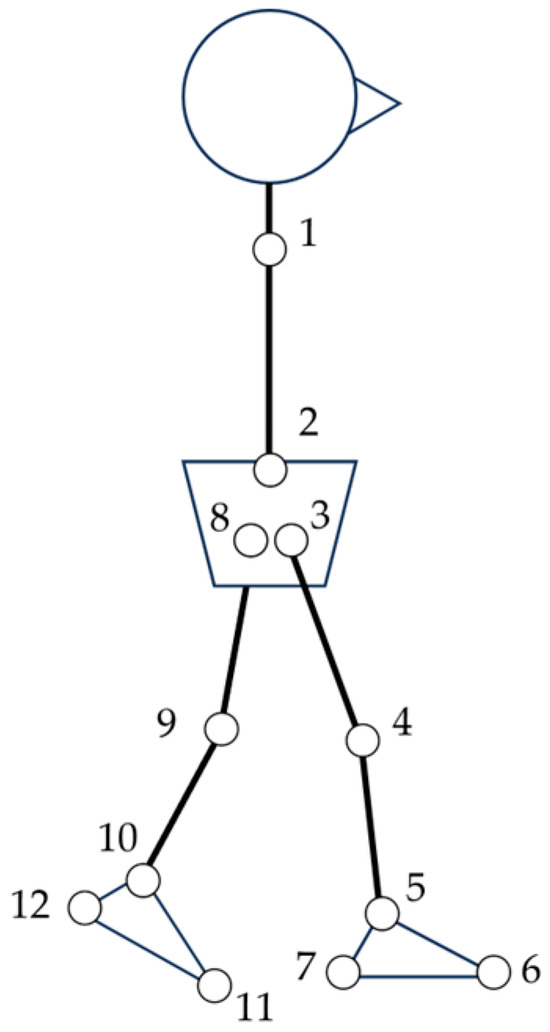Schema of the positions of joint centers estimated by OpenPose. Feature points are as follows: 1—Neck, 2—MidHip, 3—RHip, 4—RKnee, 5—RAnkle, 6—RBigToe, 7—RHeel, 8—LHip, 9—LKnee, 10—LAnkle, 11—LBigToe, 12—LHeel. Definition of joint angles is as follows: the ankle joint angle is defined as the angle between axes 6 and 7 and 4 and 5, and between axes 11 and 12 and 9 and 10. The knee joint angle is defined as the angle between axes 3 and 4 and 4 and 5, and between axes 8 and 9 and 9 and 10. The hip joint angle is defined as the angle between axes 1 and 2 and 3 and 4, and between axes 1 and 2 and 8 and 9.