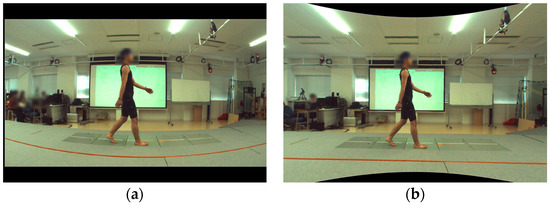 Lens distortion correction by Vicon Nexus version of 2.10. using calibration information from the Vicon system. (a) Pre-correction; (b) post-correction.