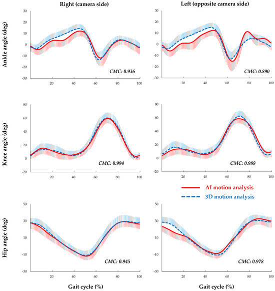 The waveform patterns in the sagittal plane of each joint during a gait cycle. Right: camera side, left: opposite camera side, red line: artificial intelligence-based (AI) motion analysis, blue-dashed line: three-dimensional (3D) motion analysis, CMC: the coefficient of multiple correlation (CMC) which indicates the waveform pattern similarity between AI and 3D motion analysis.