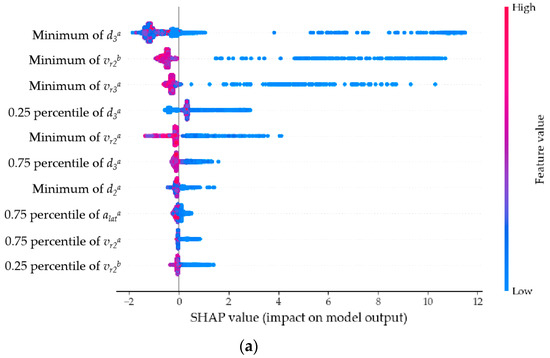 Figure 10 displays the specific impact of each sample feature on the detection model results within the SHAP interpretation framework. Figure 10a–c show the results for the three types of COB, TB, and CIB abnormal lane-changing behaviors, respectively. The vertical axis represents different features, while the horizontal axis represents the SHAP value of each sample feature. The depth of color corresponds to the color bar on the right, reflecting the magnitude of the sample feature value. For example, in Figure 10a, for the first three features, when the individual feature values are small, they exhibit large SHAP values, indicating a negative correlation. In Figure 10b, the second feature, maximum value of vb, shows the opposite pattern: when the individual feature value is large, the SHAP value is also large, indicating a positive correlation.