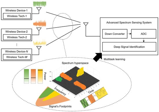 Figure 1 illustrates the operation of an advanced SS system. N wireless devices in the same spectrum band use W wireless technologies to communicate with each other. Some devices are secondary users performing spectrum sharing, which is considered one of the wireless technologies. Signals with similar characteristics can be grouped to reduce the number of types that need to be identified [34].