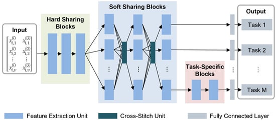 MTL models have more weight parameters to be tuned during training than single-task learning models [35]. To establish effective learning strategies, we consider a hybrid network structure that combines hard sharing blocks (HBs) and soft sharing blocks (SBs). HBs extract common features shared by tasks through tightly coupled sharing layers, while an SB has a different layer for each task and shares information through a unit called a cross-stitch [36]. An HB uses unified shared layers, resulting in less memory usage and faster inference, but this may cause competition among tasks. In contrast, an SB consists of individual layers for each task, including the shared part, resulting in relatively less competition for each task.