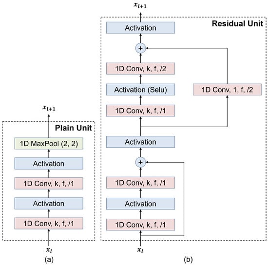 There are two feature extraction units: a plain unit and a residual unit. The plain unit consists of two consecutive 1D convolutional (1D Conv) layers followed by a 1D max pooling (1D MaxPool) layer, as illustrated in Figure 3a. The parameters k, f, and / n represent the kernel size, number of filters, and stride of the 1D Conv layers, respectively.