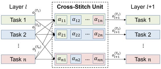 where o l + 1 ( T i ) i = 1 n is the transformed output associated with tasks T 1 to T n , α i j is a trainable parameter associated with tasks T i and T j , and o l ( T i ) i = 1 n is the input of the cross-stitch unit. By jointly training the parameters α i j , the cross-stitch unit learns the relationship between tasks by itself.