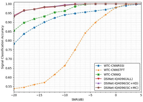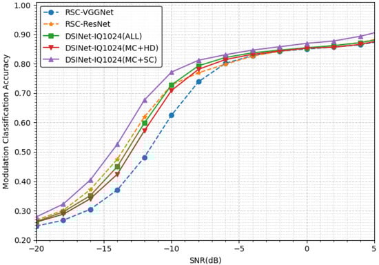 We can see that signal classification is not helpful for modulation classification. However, the power values that exist in different spectrum spaces are helpful to some extent, as shown in the performance of DSINet (mc + pe).