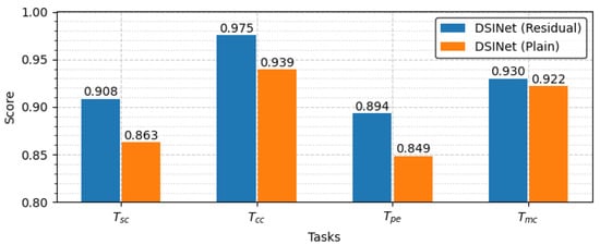DSINet’s performance is significantly affected by how it utilizes the feature extraction units within a block, as with all other AI models. As described in Section 3.3, we consider two feature extraction units, a residual unit and a plain unit, and the performance achieved on each task when these units are applied to DSINet is shown in Figure 8. The scores obtained for the classification tasks, including T s c , T c c and T m c , represent accuracy, while the scores obtained for the regression task, which is T p e , represent R 2 s c o r e s. The residual unit achieves good performance in terms of deep signal identification as well as in various fields. The residual unit solves the vanishing problem, and the network depth is relatively deep compared to the plain unit, so it achieves scores of 0.908, 0.975, 0.894, and 0.930 for each task.