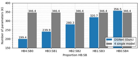 The overall performance of DSINet increases sharply at the HB3:SB1 point on the x-axis, and thereafter, the performance tends to increase slightly as the proportion of SBs increases. Since the SBs allow each task to learn its own features through independent weight parameters, the overall performance is enhanced. However, the use of too many SBs results in high memory usage and a slow inference speed. Figure 10 and Figure 11 show the number of parameters (memory usage) and the number of floating point operations (FLOPs) according to the increase in the SB proportion, respectively. The number of parameters indicates a small memory usage level of approximately 199.4K in SB0, but this usage gradually increases as SB increases, and in SB4, the memory usage of 356.6K exceeds that of four single models (gray box). The number of FLOPs also increases gradually, similar to the number of parameters, and it increases sharply, especially starting from SB2. The numbers of parameters and FLOPs can increase more rapidly as the number of tasks increases. Therefore, we select the DSINet variant with HB3:SB1 as the best model, as it exhibits rapid performance improvement without significantly increasing the numbers of parameters and FLOPs.