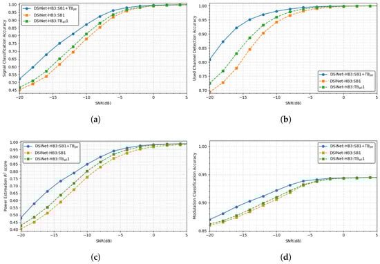 Figure 12. Performance comparison among the DSINet variants according to the block combinations in (a) T s c , A c c u r a c y of signal classification; (b) T c c , A c c u r a c y of used channel detection; (c) T p e , R 2 s c o r e of power estimation; and (d) T m c , A c c u r a c y of modulation classification.