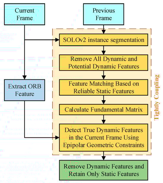 We propose a tight-coupling approach that utilizes the fundamental matrix Fm as a bridge between semantic information and geometric constraint information. Firstly, we employ SOLOv2 to perform instance segmentation on frames of the scenario to obtain motion priors, which identify all moving and potential moving targets. We then use the instance segmentation results as a mask to remove the correspondences of dynamic and potential dynamic features, retaining only reliable static feature correspondences. Based on these static feature correspondences, we perform feature matching and compute the reliable fundamental matrix. Finally, we use multi-view geometry constraints to detect and remove true dynamic features, retaining only static feature points for subsequent tracking and mapping. When judging the motion state of a feature point, we use a threshold value of d. If d exceeds one pixel size, the feature point is judged as dynamic and removed, and if d is smaller than a pixel size, it is judged as static and retained.