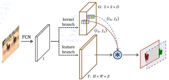 The SOLOv2 network architecture is shown in Figure 3, and it mainly comprises Fully Convolutional Network (FCN) feature extraction, a kernel branch, and a feature branch. The convolution kernel matrix is denoted as G, while the mask feature matrix is represented by F. SOLOv2 divides the image into S × S grids, treating each grid as a potential target instance. After the original image is passed through the FCN, the feature map is obtained, which then enters both the kernel branch and the feature branch. The kernel branch predicts the dynamic kernel to obtain different kernels for different inputs, while the feature branch predicts the features for each point on the feature map. Finally, the outputs of the kernel branch and feature branch are convolved to obtain the mask of the target in the image.