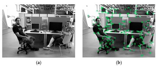 Figure 4a shows the relationship between static object points and their corresponding feature points in two frames. P is a static target point which is imaged in two consecutive image frames corresponding to feature points p1 and p2 in frame I1 and frame I2, respectively. P? represents the possible position of point P in the presence of uncertain factors. O1 and O2 are the camera centers corresponding to frame I1 and frame I2, respectively. Polar plane π intersects image planes I1 and I2 at polar lines l1 and l2, respectively, and baseline O1O2 intersects image planes I1 and I2 at poles e1 and e2, respectively. P lies on rays and , and p2 lies on epipolar line l2. The multi-view geometric constraint describes the corresponding epipolar mapping from the points on frame I1 and frame I2, and the mapping relationship can be described by the fundamental matrix Fm.