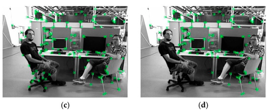 Given p1 in frame I1 and the fundamental matrix Fm, Equation (1) provides the constraints that p2 must satisfy when P is a static target point. Therefore, we can use this constraint to judge whether the target point corresponding to the ORB feature point is dynamic. Due to the uncertainty in the process of extracting features and estimating Fm, there is a high probability that the two image points in the static map do not strictly satisfy Equation (1), that is, p2 in Figure 4b should be located on l2. If the distance d between p2 and l2 is smaller than a predetermined threshold, the motion state of the target point corresponding to the image point is regarded as static; otherwise, it is regarded as dynamic.