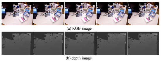 We utilized the partial sequence located in the fr1/room of the TUM dataset to conduct our local semantic mapping evaluation. This dataset provides us with RGB images, depth images, and the precise position and orientation of the camera. For our mapping test, we selected five consecutive frames of images. Figure 7a shows the RGB images of the selected frames, while Figure 7b displays the corresponding depth images.