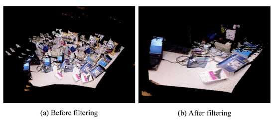 where fx and fy are the focal length of the RGB-D camera, and cx and cy are the offsets of the image origin relative to the imaging point of the camera’s optical center. By applying this transformation to the pixels in the key image frames, we can obtain the corresponding point cloud.