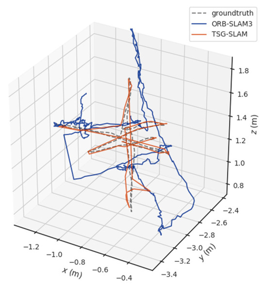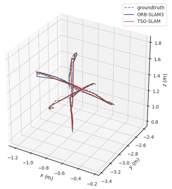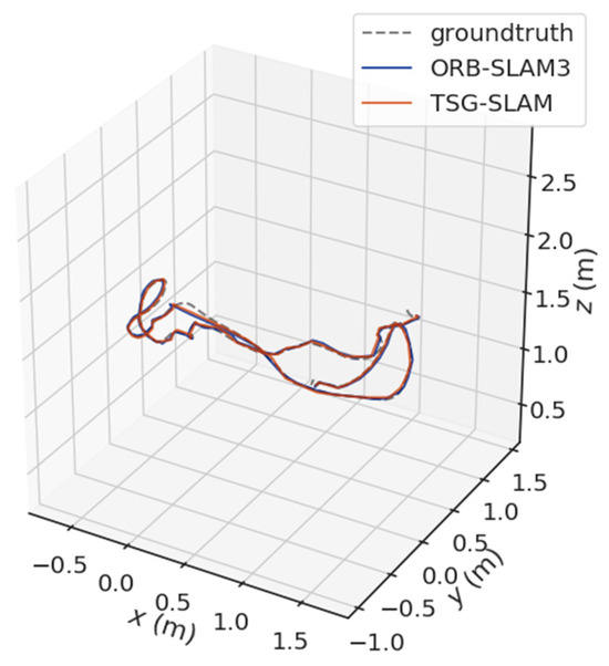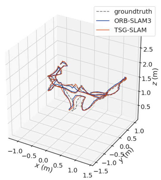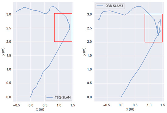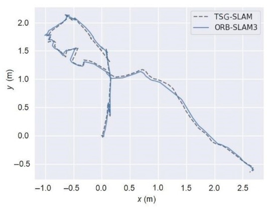 In real-world scenarios, it is challenging to obtain an accurate camera motion trajectory. Therefore, the estimated trajectories of TSG-SLAM and ORB-SLAM3 were compared based on the dataset captured by the mobile robot in the experimental scenario. As the ground upon which the mobile robot moves is nearly horizontal, a 2D estimated trajectory plot in the x-y direction was created to facilitate the comparison of the estimated trajectories.