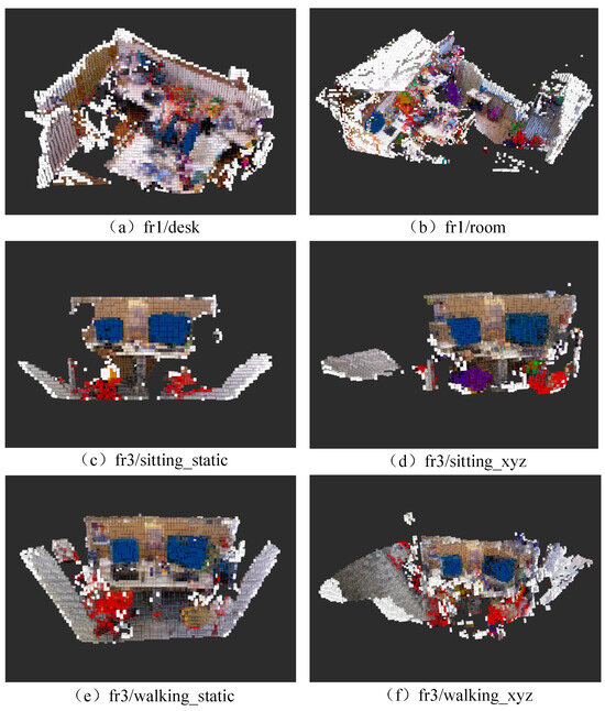 An experimental evaluation was conducted to assess the instance-level semantic mapping performance of TSG-SLAM in static, low-dynamic, and high-dynamic scenarios. Figure 18 depicts the results of scene semantic mapping on six datasets, including fr1/desk, fr1/room, fr3/sitting_static, fr3/sitting_xyz, fr3/walking_static, and fr3/walking_xyz. TSG-SLAM successfully constructs 3D geometric models of the objects in the scenarios and adds semantic tag color information for the objects, which enhances the map’s visualization, such as the blue screen, red chair, and gray table.