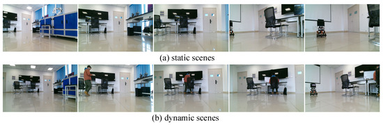 In order to verify the effectiveness of the TSG-SLAM system in real-world scenarios, experiments on the simultaneous localization and semantic mapping of mobile robots were conducted in an indoor laboratory. Due to the challenge of replicating identical trajectories for a mobile robot, an experiment was conducted using a mobile robot that was remotely controlled to move around in an indoor laboratory. A dataset was generated with the camera’s viewpoint identical to that of the robot’s movements which was used to evaluate the ORB-SLAM3 and TSG-SLAM systems. The evaluation was carried out on two different experimental scenarios, one static and the other dynamic, to assess the system’s performance in simultaneous localization and semantic mapping. To simulate a dynamic environment, the experimenter moved freely around the scenario, capturing image sequences from various angles, as shown in Figure 19.