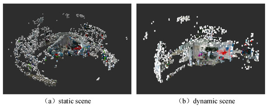 Figure 18a,b show the results of semantic map construction for the indoor static scenario with the desktop as the main object and the larger global static scenario, respectively. The scenarios and targets appearing in the sequence were accurately reconstructed, and semantic color information was added to the targets.