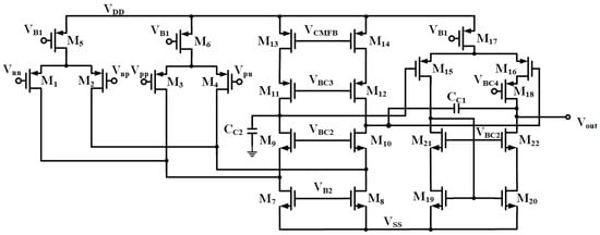 In addition, the DDA can be designed to operate in the subthreshold region in order to lower the operating supply voltage. A gate-source-driven DDA, which is able to operate at a supply voltage of 1 V, is shown in Figure 2 [31]. The first stage consists of transistors M1–M14, which not only implements the inputs of the DDA but also employs a fully differential folded cascode structure to enhance the gain as the first step. The signal from the first stage is then converted to a differential-to-single-ended gain stage consisting of transistors M15–M22 to further boost the gain. It is noted that M18 is added at the output branch to form the cascode structure to increase the gain as the second step. CC1 is the Miller frequency compensation capacitor, whereas the grounded CC2 is used to stabilize the common-mode feedback loop in the differential amplifier.