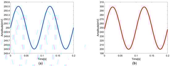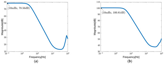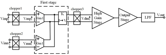 where and represent the offset voltage of each input port, while and denote the noise of each input port. Equations (3) and (4) reveal that the input choppers shift the differential input signals to the odd harmonics of the chopping frequency, while noise and bias voltages remain in the baseband spectrum. Subsequently, the input combined signals are converted into current signals by transconductors with identical transconductance gains of . At the outputs of transconductors, these currents are summed and then transformed into voltage signals by a transimpedance amplifier with a gain denoted as . The output voltage signal of the transimpedance amplifier undergoes further processing through the output chopper demodulator. The resulting voltage signal can be expressed as