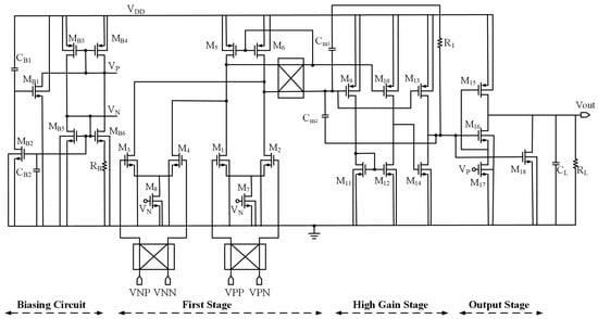In recent years, there has been a growing interest in the field of ultra-low-power and ultra-low-voltage circuit technologies [1,2,3,4,5]. This heightened interest can be attributed to advancements in technology and the rising demand for biomedical devices [6,7] and so forth. Circuits operating in the subthreshold region offer the advantage of significantly reduced power consumption, making them a practical approach for achieving both lower power consumption and lower supply voltages. Given the exponential relationship between VGS and ID of transistors operating in weak inversion, circuits can benefit from a high gm/ID ratio, which enhances their performance. However, the limitation of low supply voltage poses challenges in the implementation of cascode amplifiers, thereby making the construction of high-gain amplifiers more complex. Thus, the need arises for multi-stage amplifiers and their stability through effective frequency compensation.