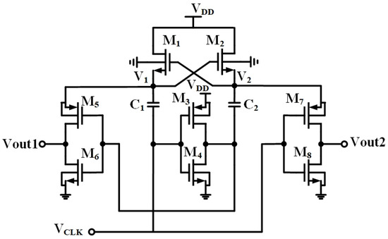 For the low-voltage chopper modulator design, the clock generated by the oscillator is not sufficient to drive the chopper switches, due to the supply voltage limitation. Therefore, a clock booster is essential to enable the chopper to operate effectively under the low-voltage condition. The conventional Dickson charge pump circuit can achieve the multiplication of clock swing. However, its performance is constrained by the threshold voltage drop of NMOS transistors and the reverse charge-sharing phenomenon. In view of the previously mentioned issues, an alternative charge pump circuit [32] was employed, and its circuit is illustrated in Figure 6.