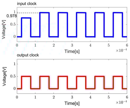The output on the left side of the circuit Vout1 operates in a similar principle but with opposite polarity. The clock signals Vout1 and Vout2 are complementary. Given that Vout1 is in phase with the input clock, it is used as the final output. To minimize chip area, the capacitance on the right side is reduced. The sizes of components and simulation results are illustrated in Table 3 and Figure 7, respectively. From Figure 7, it is evident that the amplitude of the output signal can be boosted to almost twice the amplitude of the input clock, specifically increasing from 500 mV to 978 mV.