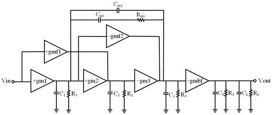 In order to analyze the stability of the circuit, the transfer function is first analyzed on the basis of the following assumptions. (1) . (2) Some parasitic capacitances, including , are ignored due to small values. (3) The gain of each stage is much greater than one (i.e., ). Thus, the transfer function is given as
