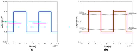 Figure 14a shows a 500 Hz pulse signal swinging from 200 mV to 300 mV being used for evaluation of the transient response of the chopper-stabilized DDA operating in a unity-gain configuration. The output signal is shown in Figure 14b, from which the slew rate SR+/SR− can be calculated as 150.00/54.54 V/ms, respectively.
