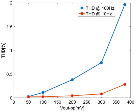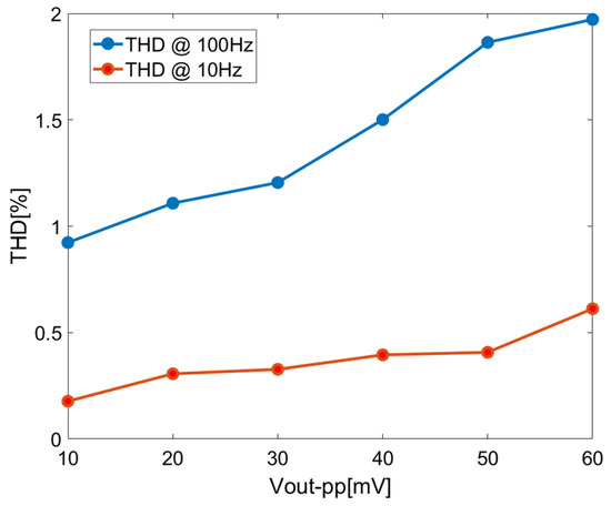 Figure 21 shows the relation between THD and the amplitude of the output signal for 10 Hz and 100 Hz input signals of the closed-loop chopper-stabilized DDA with the LPF. In this application setup, a quiescent bias of 300 mV is used in the input port to maximize the input dynamic according to the input common mode range, as shown in Figure 13. Referring to Figure 21, for THD < 2% as the limit, the amplitude of the output signal is less than 60 mVpp in rms value. Combining the output noise floor of 256 µVrms, the DR can be calculated as 38.3 dB. In general, distortion increases with the increase in closed-loop gain in the amplifier. Hence, the maximum allowable output for a particular distortion level is reduced. As such, DR is governed by the closed-loop gain factor. It is also possible to improve DR further but at the expense of increased power consumption as the tradeoff.