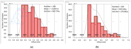 Input-referred offset: (a) chopper disabled, (b) chopper enabled.
