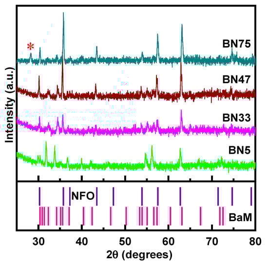 Representative X-ray diffraction data for BNx composites. All the composites bear the signatures of NFO and BaM. The stick patterns for NFO and BaM are shown in the bottom pane to visualize the one-to-one correspondence of the Braggs positions of each phase to the respective NFO and BaM lines. BN75 contains a small amount of an impurity phase, Ba5Fe2O8, and is denoted by a star.