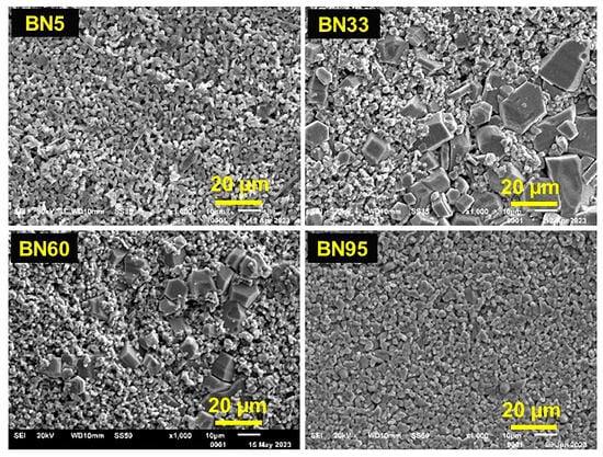 SEM images for BN5, BN33, BN60, and BN95 composites. There are no notable features in the image for BN5. Well-defined hexagonal grains corresponding to the BaM phase are seen in BN33 and BN60. BN95 does not show any hexagonal grain.