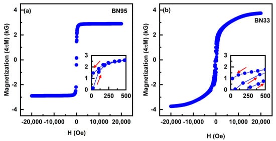 Room-temperature magnetization 4πM vs. magnetic field H data for (a) BN95 and (b) BN33 samples. The insets for low H-values clearly show the expected hysteresis and remanence in the M vs. H data. The arrows in the inset indicate which way the magnetic field increases or decreases.