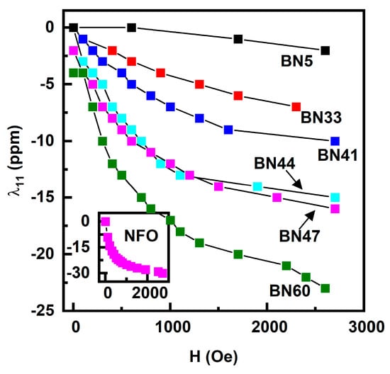 Since the magnetostriction λ is one of the key parameters that determine the strength ME interaction, we measured its value for the BNx composites. The measurements were completed with a strain gauge and a strain indicator and, for H, were was applied parallel to the sample plane and to the length of the strain gauge. Data on the magnetostriction λ11 vs. H are shown in Figure 4. The samples exhibit negative values for λ11 as expected since both NFO and BaM have negative λ11 values [,]. None of the λ11 values for the composites in Figure 3 show saturation for the maximum H-values of ~3 kOe. With increases in the NFO content, λ11 values at 3 kOe increase and tend to show similar behavior as pure NFO (shown in the inset of Figure 4). The highest value of λ11 ~−23 ppm was measured for BN60, and similar values were obtained for x ≥ 60. Our measurements of pure BaM showed λ11 = −1 ppm at 2.7 kOe. Hence, it is clear that the NFO phase is the major contributor to the net magnetostriction of BNx composites.