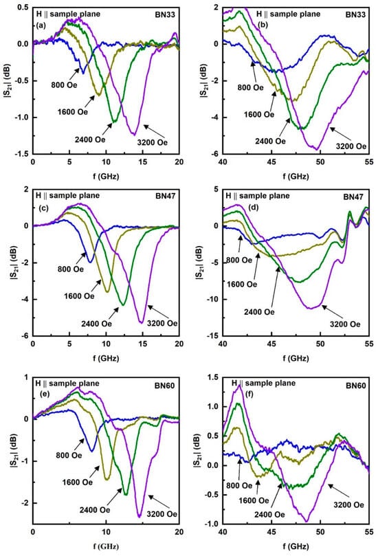 Profiles of S21 vs. f showing resonances in BN33, BN47, and BN60 composites for in-plane static magnetic fields. The absorption in the profiles in (a,c,e) for 5–20 GHz is due to ferromagnetic resonance in the NFO contents of BNx. Profiles in (b,d,f) show absorption due to a magneto-dielectric mode in the composites.