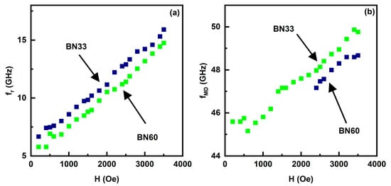 The H-dependence of the low- and high frequency mode frequencies fr are shown in Figure 6 (and in Supplementary Figure S5). Data on fr vs. H for the low-frequency mode are shown in Figure 6a for BN33 and BN60. With fr increasing from 8.6 GHz at H = 1 kOe to 15.9 GHz for H = 3.5 kOe for BN60, which amounts to an increase in fr at the rate 2.8 GHz/kOe. A similar rapid increase in fr with H is seen in Figure 6a for BN33. Based on the rate of change in fr with H, one may associate this mode with FMR in NFO. Figure 6b shows fr vs. H for the high frequency mode for BN33 and BN60. In Figure 5 and Figure S5, this mode shows a variation in fr with H that could be approximated to a linear increase ~1.3 GHz/kOe. This slow variation in fr with H is indicative of a magneto-dielectric mode in the composite platelet. This mode is not of importance for the current study and is not considered in further analysis [].