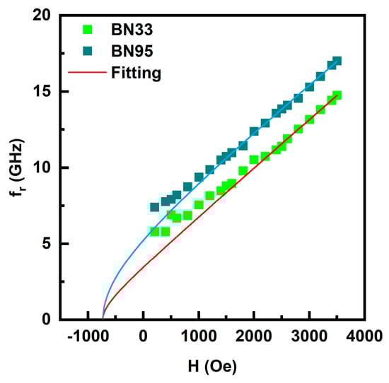 Ferromagnetic resonance frequency fr as a function of H for (a) FMR observed in the low frequency region in Figure 5 and (b) magneto-dielectric mode frequency vs. H for BNx composites.