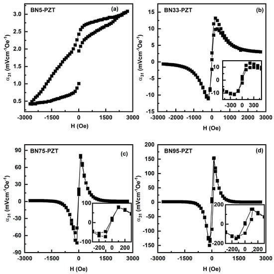 It is also clear from the results of ME measurements in Figure 8, Figure 9 and Figure 10 that the bilayers of BNx and PZT show MEVCs that are much higher than the values reported for M-type hexaferrite-PZT bilayers [], but smaller than those reported for NFO-PZT []. Under the optimum value of H, the highest MEVCs are α31 = 152 mV/cm Oe and α33 = 90 mV/cm Oe, both for BN95-PZT. These values, however, are relatively small due to the weak piezomagnetic coupling strengths in BNx compared to nickel ferrite or nickel zinc ferrite-based layered composites with PZT [,].