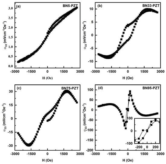 Similar MEVC α33 vs. H data as in Figure 7 for H, and h applied perpendicular to the sample plane for bilayers of (a) BN5-PZT, (b) BN33-PZT, (c) BN75-PZT and (d) BN95-PZT.