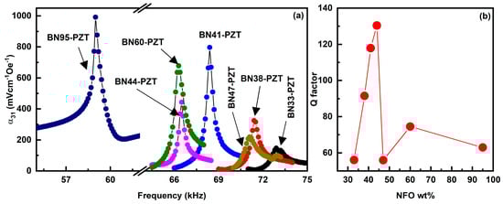 The strength of ME coupling in the bilayers was also characterized by measuring the ac magnetic field frequency f dependence of the MEVC at mechanical resonance modes. Prior to these measurements, we obtained the electromechanical resonance (EMR) frequencies (fr) for the composites by measuring the frequency dependence of the impedance with an LCR meter. Mode frequencies could not be obtained for BNx for x ≤ 19, but we were able to determine the frequency of longitudinal resonance modes for higher x-values. MEVC α31vs f under a bias field H = 100–200 Oe for the bilayers is shown in Figure 10. One observes an increase in α31 with increasing f and a sharp peak in its value at fr ~ 55–75 kHz. We were able to identify fr with the longitudinal EMR mode from the known composite dimensions. For x = 33, the figure shows a fine structure with a double peak in the α31vs f profile with values of 147 mV/cm Oe at 72.9 kHz and 132 mV/cm Oe at 73.2 kHz. Bilayers of BNx-PZT with x > 33 have a single peak in the profiles and BN95-PZT shows the highest value of α31 = 992 mVcm−1Oe−1 at 59 kHz. One observes a significant enhancement in the ME coefficients at fr compared to values at 100 Hz (Figure 8), and for example, by a factor 36 for x = 41. The highest Q-factor obtained from this data is found to be 130.4 for BN44. BN41 also has a large Q-factor of 118. After BN44, the Q-factor reduced to 75 at BN60. We discuss the results of these ME measurements in the following section.