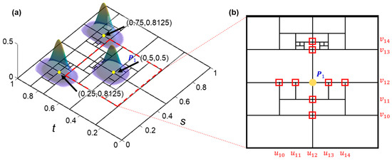 As presented in Figure 1a, a T-spline blending function is a locally supported B-spline basis function that can be recursively calculated using de Boor–Cox’s recursion formulae [13]. Given the knot vectors and of a natural bicubic spline with the multiplicity of one, the recursively obtained blending functions have the following forms, with which repetitive recursion calculations can be avoided in practical calculations: