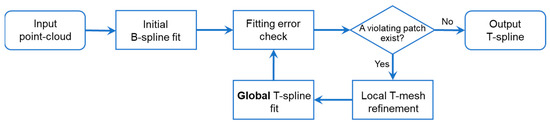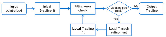 The local T-spline fitting algorithm consists of the following four minor steps following the flow chart in Figure 4. The last three steps are iteratively applied until all measured points meet a pre-set tolerance.