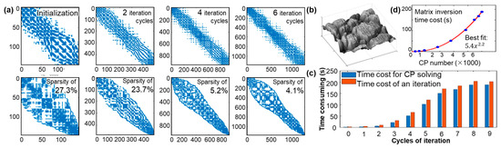 In global strategies, if a violating grid element is refined, the newly inserted CPs and the original CPs are updated from all the input sample data through Equation (4). This global strategy results in tedious calculations, including repetitive design matrix updates and their pseudo-inverse. Figure 3c,d shows an experimental fitting analysis of a stainless steel surface in Figure 3b. It indicates that the spline model complexity quickly increased in the initial iteration cycles. During the last several cycles until the computation converged, the CP number grew slowly and finally approached zero. Simultaneously, the time cost for CP-solving continued to increase, and the design matrix’s sparsity gradually converged to a small percentage. Figure 3c,d also shows that most computing resources focus on the pseudo-inverse-based CP-solving process. The sparsity patterns of the design matrices result in an efficiency-considerable computational complexity in for matrix inversion regarding the number of CPs. In large-scale point cloud and high-accuracy fitting cases, a design matrix may reach over a million rows and a thousand columns, resulting in it being nearly impossible to solve the least-squares problem.
